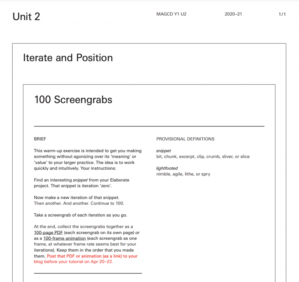 100 screengrab exercise – just what we need to warm up after a stagnant spring break. The brief is aiming at getting us started without pondering over ‘meaning’ or ‘value’ for the entire Iterate & Position brief.